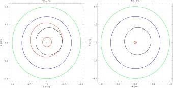 Nell’immagine di sinistra, il sistema planetario attorno alla stella XO-2S. La croce rappresenta la stella, le orbite dei suoi due pianeti (in rosso) confrontate con quelle di Mercurio (in nero), Venere (in blu) e Terra (in verde). Nell’immagine di destra, il sistema planetario XO-2N. La croce rappresenta la stella e l’orbita rossa rappresenta quella del pianeta confrontata con le orbite di Mercurio, Venere e Terra. Crediti: Slivano Desidera.