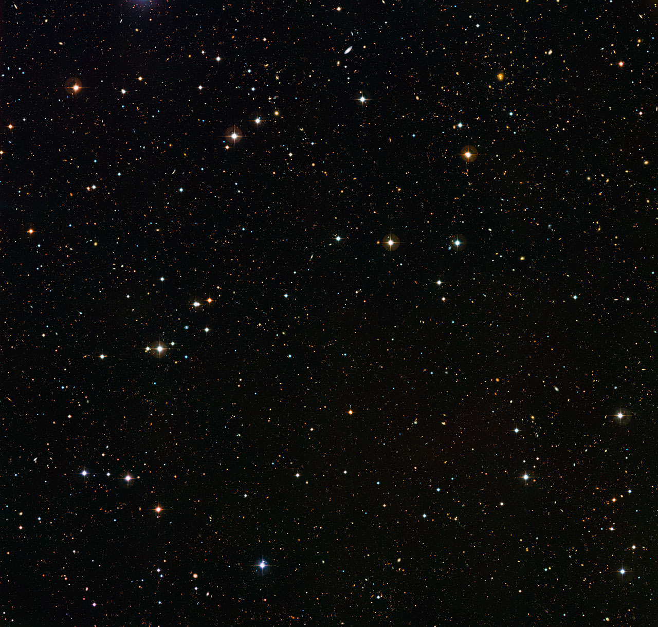Questa bellissima immagine del cielo profondo è stata scattata dal Wide Field Imager (WFI), una camera montata sul telescopio MPG/ESO di 2,2 metri a La Silla (Cile). Si tratta di uno dei cinque scatti che compongono la survey COMBO-17 (Classifying Objects by Medium-Band Observations in 17 filtri), che copre il cielo profondo nell’emisfero sud alla ricerca di oggetti estremamente lontani. Ognuna delle porzioni di cielo studiato (grandi come la luna piena) è stato analizzato utilizzando 17 filtri di colore diversi.