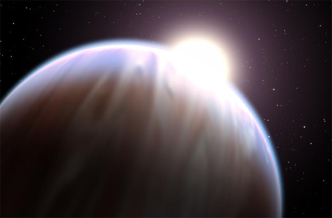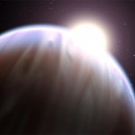 Una visione d’artista del pianeta extrasolare HD 189733b, con la sua stella “madre” che spunta da sopra il limite superiore. Gli astronomi nel 2008 hanno usato il telescopio spaziale Hubble per individuare il metano e il vapore acqueo su questo gigante gassoso osservando come la luce della stella ospite fosse filtrata dall’atmosfera del pianeta