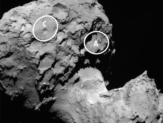 I dati raccolti da Rosetta sono stati utilizzati per scegliere i luoghi che rispondono al meglio a questi prerequisiti e i possibili candidati sopravvissuti all’analisi sono stati resi pubblici a conclusione di un meeting a porte chiuse che si è concluso domenica 24 agosto: le immagini pubblicate oggi da ESA, di cui verranno diffusi maggiori dettagli nei prossimi giorni , mostrano questi 5, esotici luoghi, denominati A, B, C, I e J (cliccare su ogni lettera per visualizzare il sito corrispondente e le sue caratteristiche). Tre sono situati nel lobo più piccolo della cometa, mentre gli altri due sono nel lobo più grande. A influenzare questa scelta, ha ovviamente avuto un ruolo sostanziale la forma inattesa e a dir poco irregolare del corpo celeste: “Basandoci sulla topografia di 67P/ Churyumov-Gerasimenko, non è una sorpresa che molti luoghi abbiano dovuto essere cancellati” dichiara Stephan Ulamec, Lander Manager del DLR. “I candidati rimasti in gioco sono considerati tecnicamente accettabili sulla base delle analisi preliminari della dinamica di volo e di altri elementi chiave: per esempio tutti e 5 forniscono almeno 6 ore complete di luce a ogni rotazione cometaria e tutti presentano terreni abbastanza piatti. Ovviamente, ogni sito ha il potenziale per scoperte scientifiche uniche.”