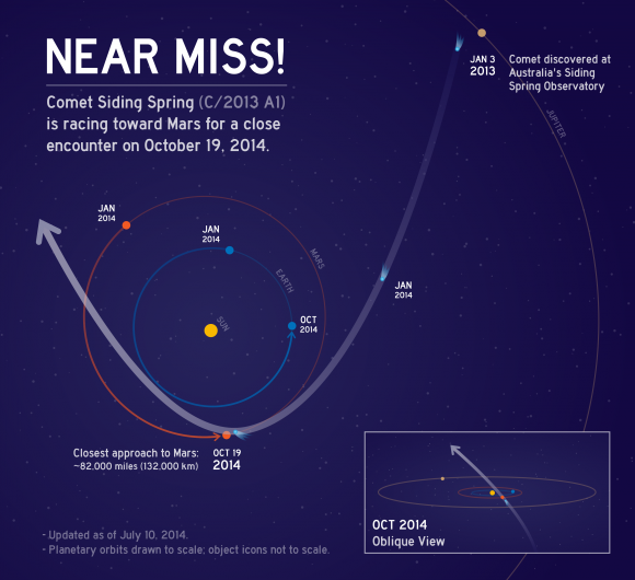 Al momento del suo passaggio ravvicinato l’intero pianeta verrà ricoperto da gas e polveri, ma non dovrebbero esserci enormi rischi per i rover e gli orbiter che, in ogni caso, per metà ottobre dovranno essere stati posti in zona di sicurezza. Il ricercatore della NASA ha però assicurato «che il rischio proveniente dalla polvere della cometa è minimo, ma ci preme comunque proteggere la nostra missione scientifica. La sicurezza è al primo posto». Siding Spring raggiungerà la sua minima distanza da Marte il prossimo 19 ottobre, quando solo 132 mila chilometri la separeranno dalla superficie del pianeta.