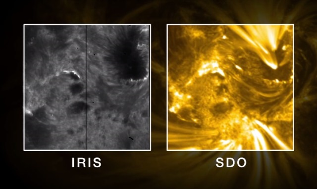IRIS mostra chiaramente una macchia solare in alto a destra. SDO ci fa vedere invece ciò che sta accadendo al di sopra: spire magnetiche giganti che “ballano” sulla superficie solare. Al momento del brillamento (al secondo 0:10 del video) si vedono linee molto luminose e nitide sia nell’immagine di IRIS che in quella di SDO e ci si può rendere conto quindi di cosa stia succedendo a temperature più basse nella cromosfera rispetto a ciò che accade negli strati più alti dell’atmosfera solare.