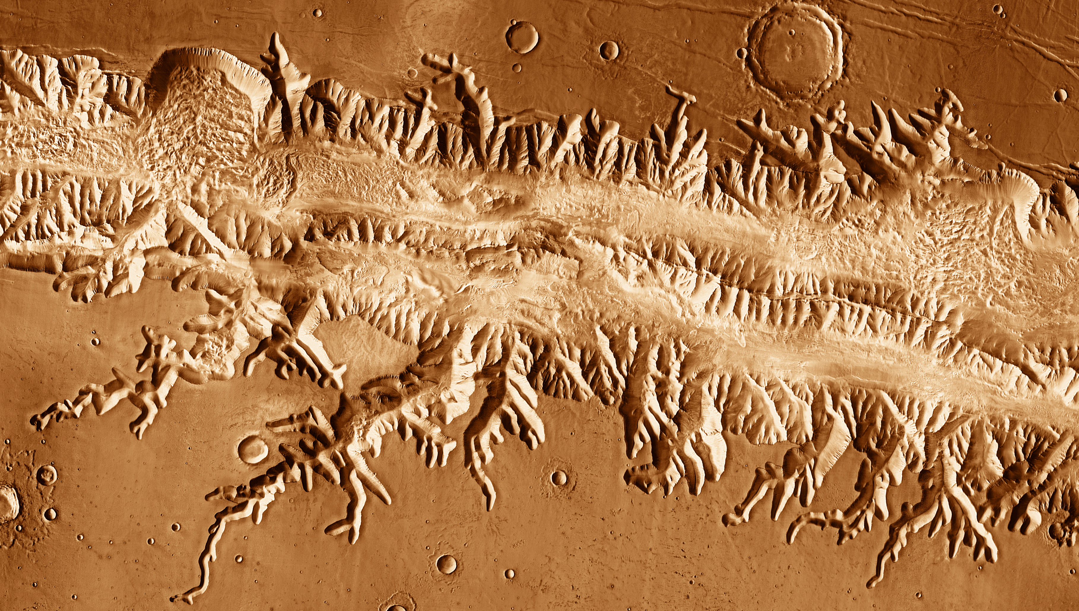 Le Valles Marineris, il complesso di fratture geologiche situato nella zona equatoriale di Marte, viene spesso definito come il Grand Canyon del Pianeta Rosso, ma le somiglianze in realtà finiscono presto. Intanto le dimensioni, che sono all’ingrosso 10 volte quelle del Grand Canyon terrestre, con uno sviluppo che si estende per quasi un quinto della circonferenza di Marte. Poi l’origine: scavato da un fiume il Grand Canyon, emerse da giganteschi sussulti tettonici le Valles Marineris, poi successivamente rimodellate ed ampliate dall’effetto erosivo di vari agenti.