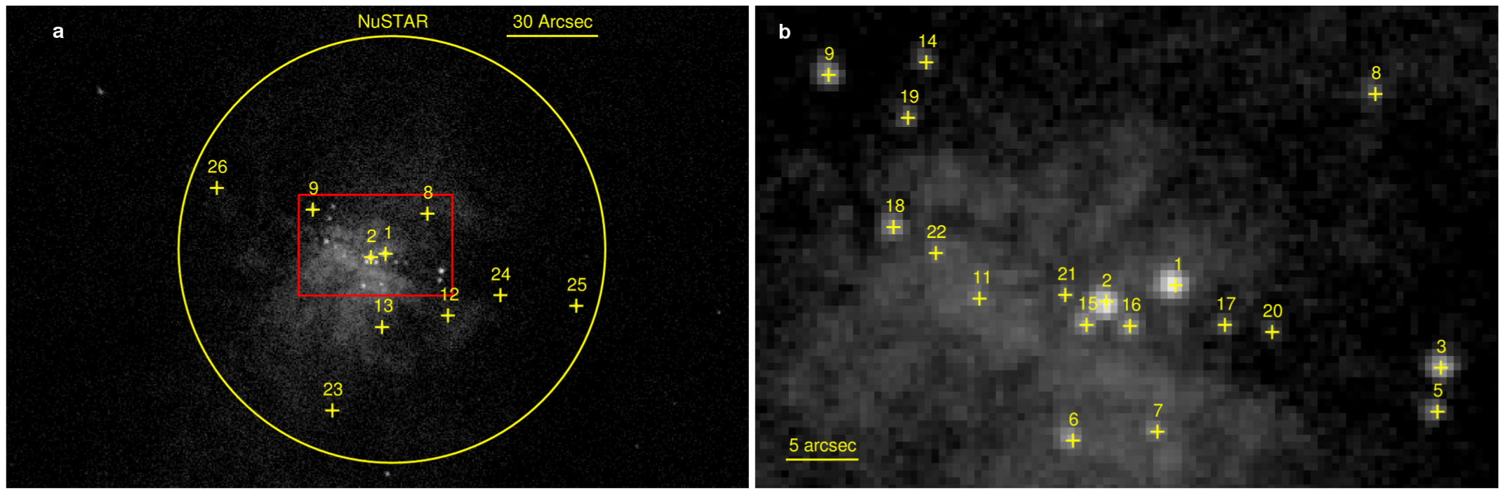 Immagine della regione centrale della M82 . All’interno di questa regione, 24 fonti puntuali di raggi X, tra cui X-1 e X-2. Il pannello b mostra una vista allargata della regione centrale. Le croci verdi indicano le posizioni delle sorgenti puntiformi identificate.