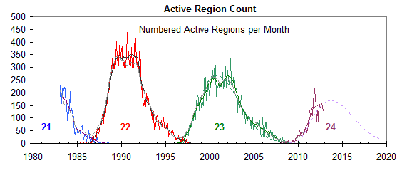 I cicli solari degli ultimi 30 anni ricavati dalle osservazioni del numero delle regioni solari attive.