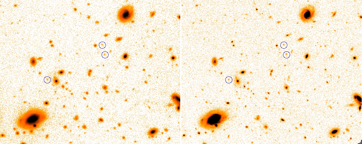 A confronto, le riprese nel vicino infrarosso di una porzione del campo osservato dalla survey HUGS: a sinistra, quelle del VLT, a destra quelle del telescopio spaziale Hubble