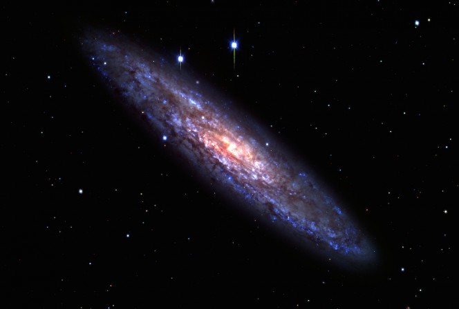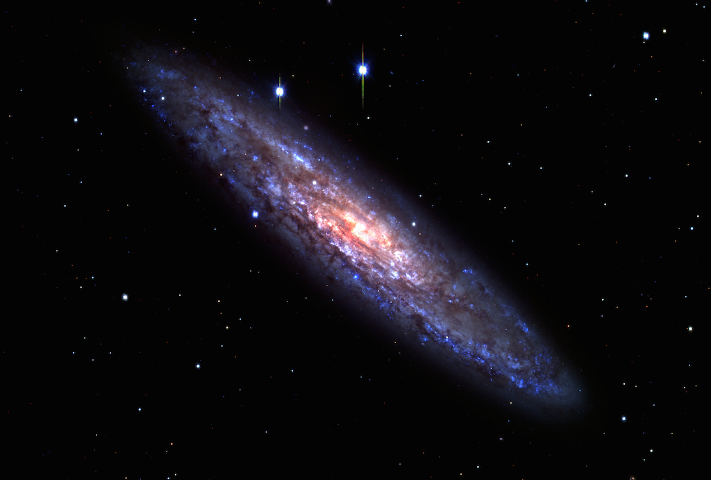 Galassia dello “scultore” NGC 253 realizzata con il VST. Immagine elaborata al Centro Dati VST di INAF -‘Osservatorio Astronomico di Capodimonte, combinando osservazioni per 29000 secondi in banda u, 2100 in banda g e 1500 secondi in banda i. Credit: L. Limatola e A. Grado (INAF)