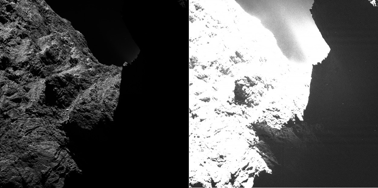 Un’immagine della cometa 67P/Churyumov-Gerasimenko scattata lo scorso 30 ottobre da OSIRIS da una distanza di circa 30 chilometri. L’immagine è mostrata con due livelli di saturazione differente: mentre nell’immagine a sinistra la metà è totalmente buia, nell’immagine a destra diventano visibili alcune caratteristiche della superficie. Credits:ESA/Rosetta/MPS for OSIRIS Team MPS/UPD/LAM/IAA/SSO/INTA/UPM/DASP/IDA