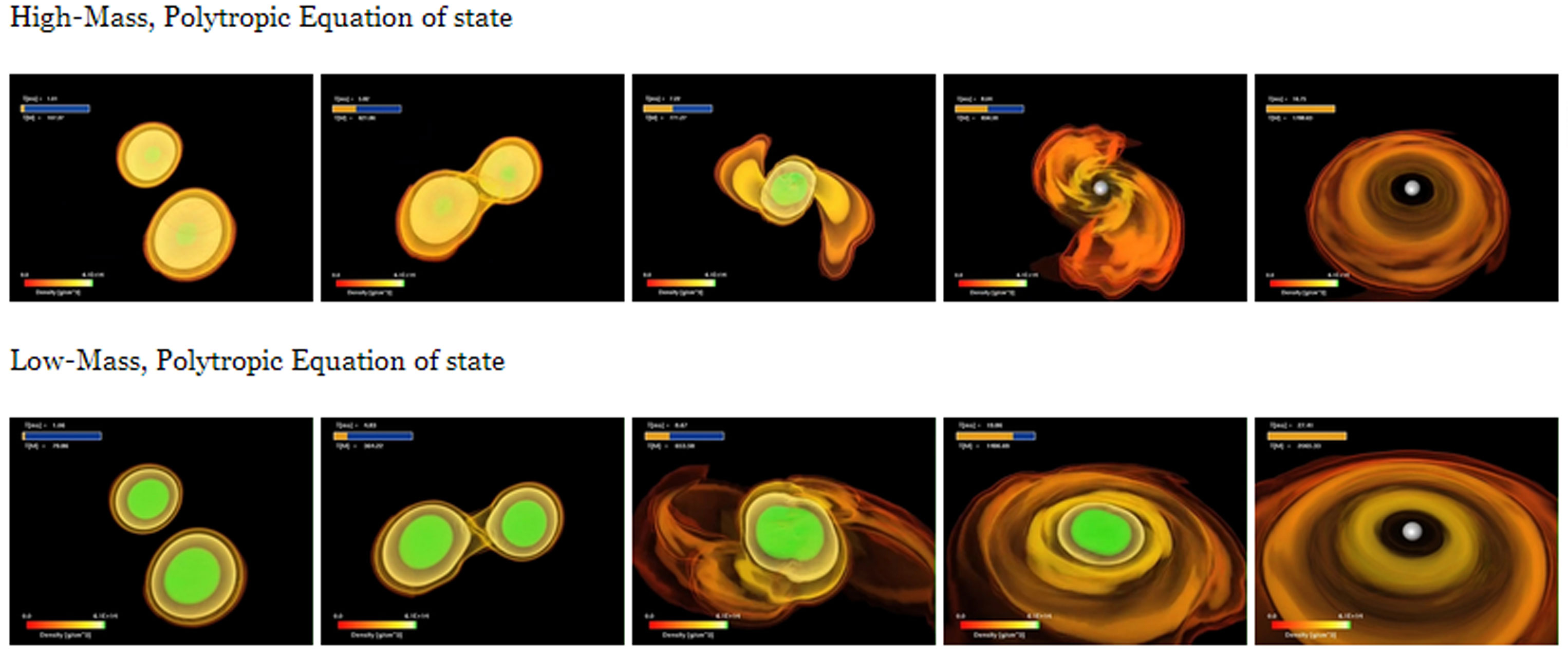 L’immagine illustra due sequenze relative alla simulazione del merging di due stelle di neutroni di massa eguale. Courtesy: L.Rezzolla/AEI,ZIB,LSU