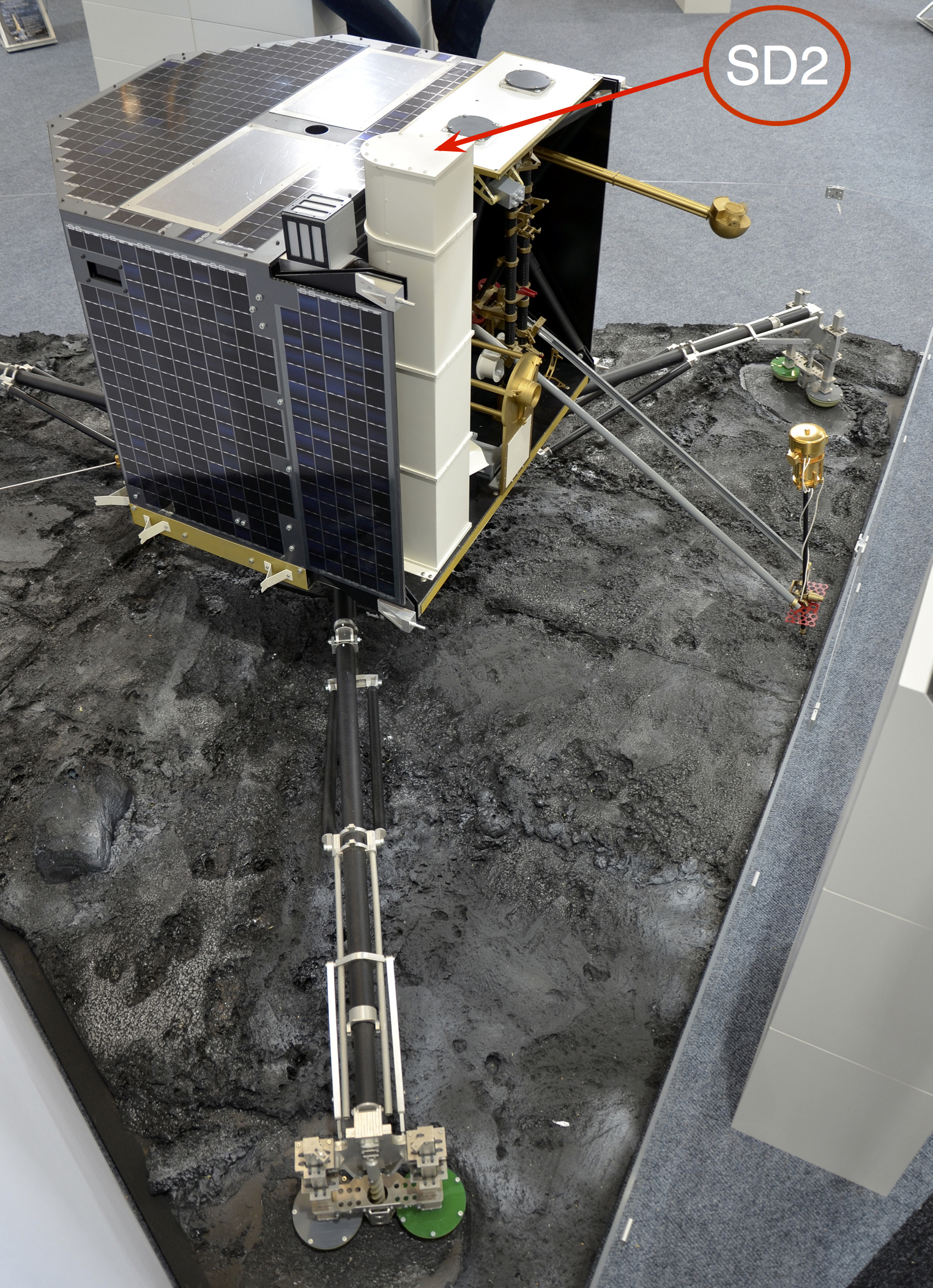Un modellino del lander Philae. La freccia indica lo strumento SD2, il trapano entrato in azione oggi. Crediti: ESA