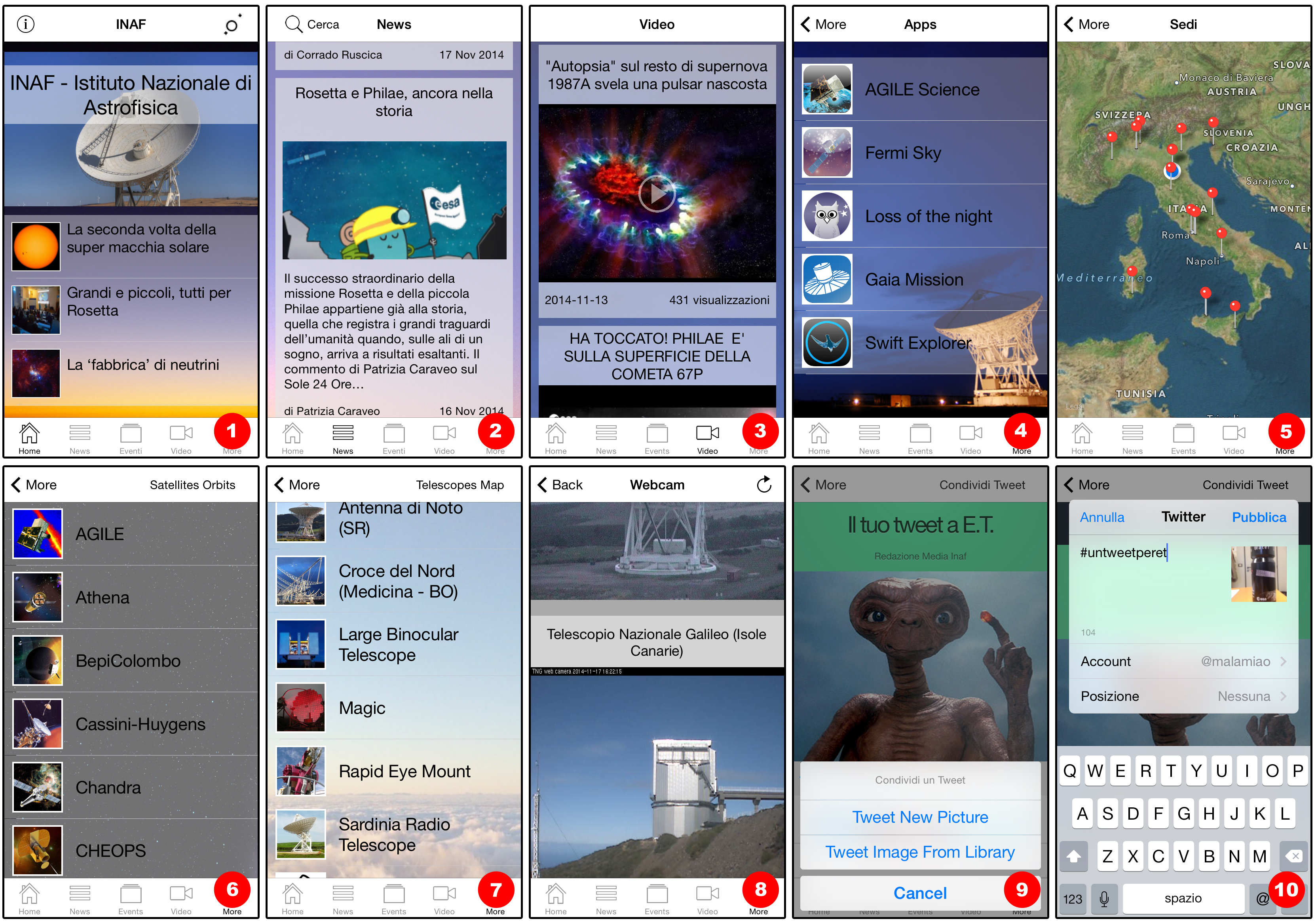 Infine, se avete un account Twitter, sempre nella sezione more vi attende una utility (9) per scattare foto e twittarle, insieme ai vostri pensieri, con l’hashtag del momento (10). Hashtag che cambia automaticamente seguendo le campagne divulgative INAF. In questo periodo, per esempio, è #untweetperet… Curiosi? E allora che aspettate a scaricare la app?