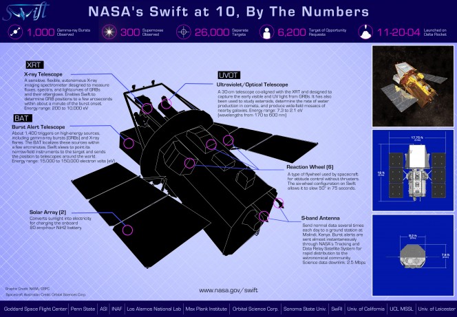 Oltre a fornire informazioni sul comportamento di oltre 900 lampi gamma, SWIFT ha osservato 300 supernovae e 700 galassie attive. Il suo telescopio ottico UV, pur di piccole dimensioni, ha prodotto una galleria unica nel suo genere di immagini di supernovae oltre a fantastici mosaici delle galassie più vicine. Vale la pena di guardare l’immagine della Large Magellanic Could, che ha richiesto 2.200 snapshot.