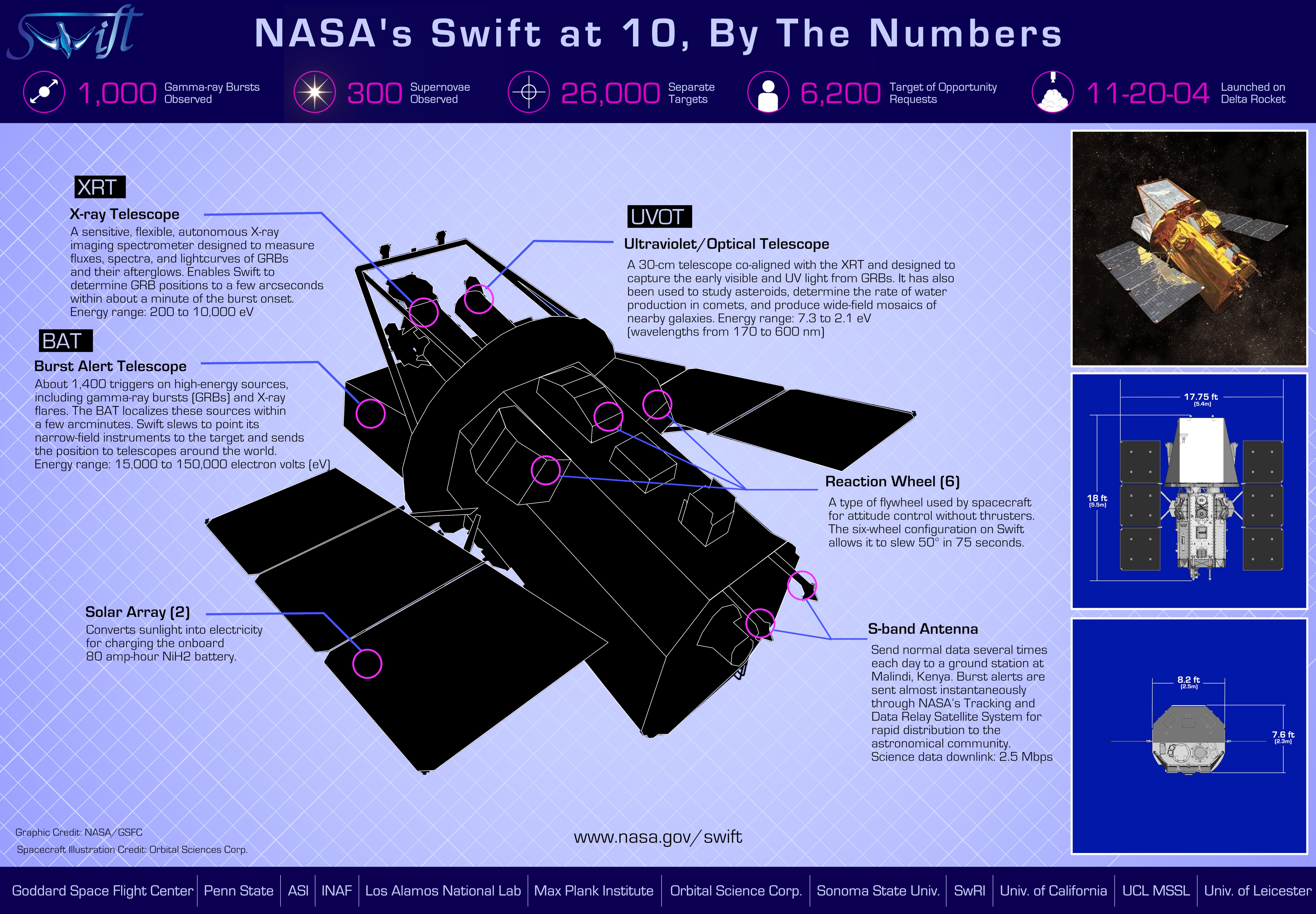 Il 20 novembre 2004 veniva lanciato da Cape Canaveral l’Osservatorio SWIFT. Si tratta di una missione NASA, con forte partecipazione italiana (ASI ed INAF) ed inglese, nata sulla scia del successo di BeppoSAX per studiare i lampi gamma grazie ad un approccio multilunghezze d’onda.