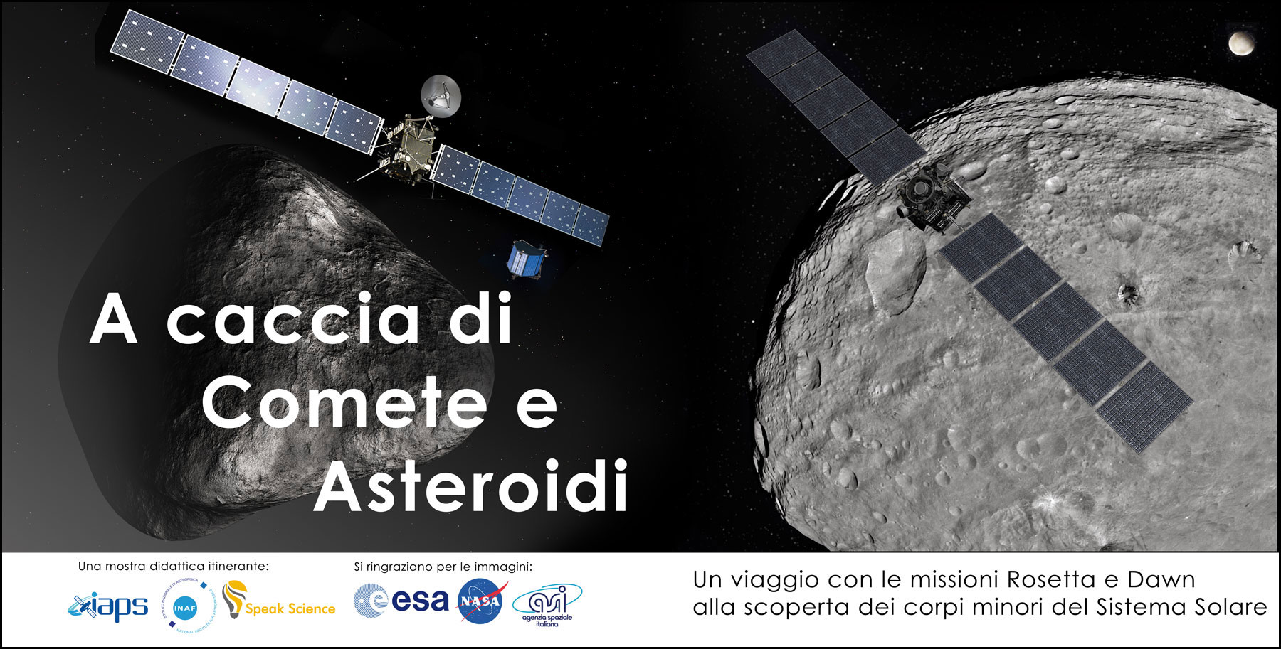 La mostra utilizza le ultime scoperte delle due sonde spaziali ESA e NASA per raccontare e spiegare la scienza dei corpi minori del Sistema Solare ed è pensata come un progetto didattico itinerante: una volta concluso questo primo evento, i pannelli che compongono il percorso verranno prestati alle scuole di Roma e dintorni selezionate per partecipare all’iniziativa. Nel corso del 2014 e del 2015, la mostra potrà dunque essere esposta presso le strutture scolastiche aderenti al progetto, che verranno supportate per organizzare delle giornate di apertura in cui i ragazzi delle classi partecipanti faranno da guida scientifica al pubblico (per maggiori informazioni, visita la pagina INAF-IAPS del progetto).