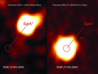 L’immagine mostra la regione di Sgr A* prima (a sinistra) e (a destra) dopo quattro giorni (29 Aprile 2013) quando è stato rivelato l’outburst dalla pulsar SGR J1745-2900. Credit: N. Rea et al. 2013/Chandra/NASA