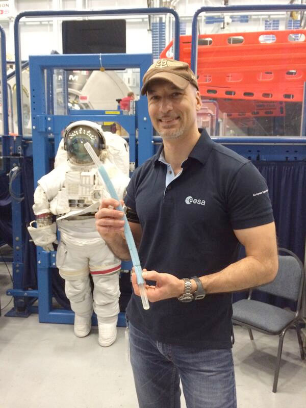 L’astronauta dell’ESA Luca Parmitano mostra il boccaglio che eviterà agli astronauti di sperimentare gli stessi problemi che ha avuto quando il suo casco ha iniziato a riempirsi d’acqua. Crediti: NASA/ESA.