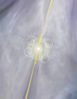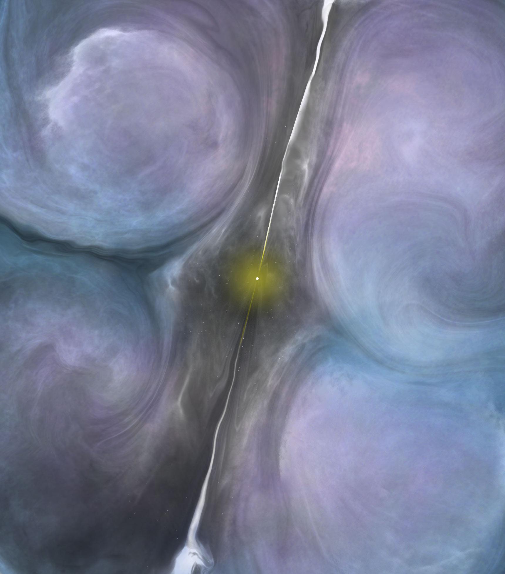 Illustrazione della regione centrale di NGC 1266 in prossimità del buco nero. Sono indicati i moti del gas (bianco) e del getto (giallo). I moti del gas producono su larga scala la turbolenza impedendo su scale più piccole la nascita di nuove stelle. Credit: B. Saxton (NRAO/AUI/NSF)