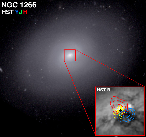 Immagine composita della galassia NGC 1266 ripresa dal telescopio Hubble e CARMA. L’immagine in basso a destra è un ingrandimento che mostra il gas molecolare, la cui distribuzione è mostrata in giallo dai dati di CARMA, diffuso dai getti del buco nero (rosso e blu). Credit: NASA/ESA Hubble; CARMA; Katey Alatalo