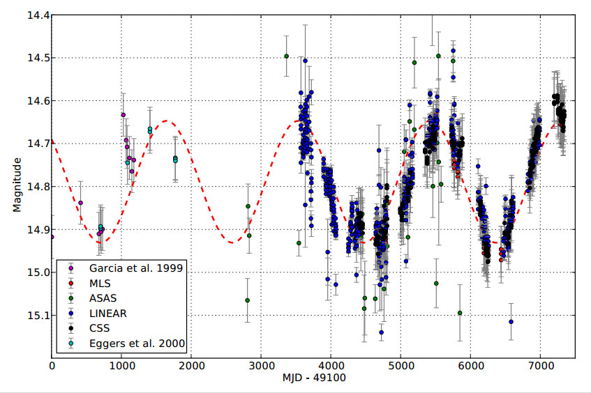 La curva di luce del quasar PG 1302-102 mostrata su un periodo di 7,338 giorni (∼ 20 anni), relativamente ai dati di due telescopi CRTS (CSS e MLS) e a quelli storici LINEAR e ASAS. Credit: M. Graham et al. 2015