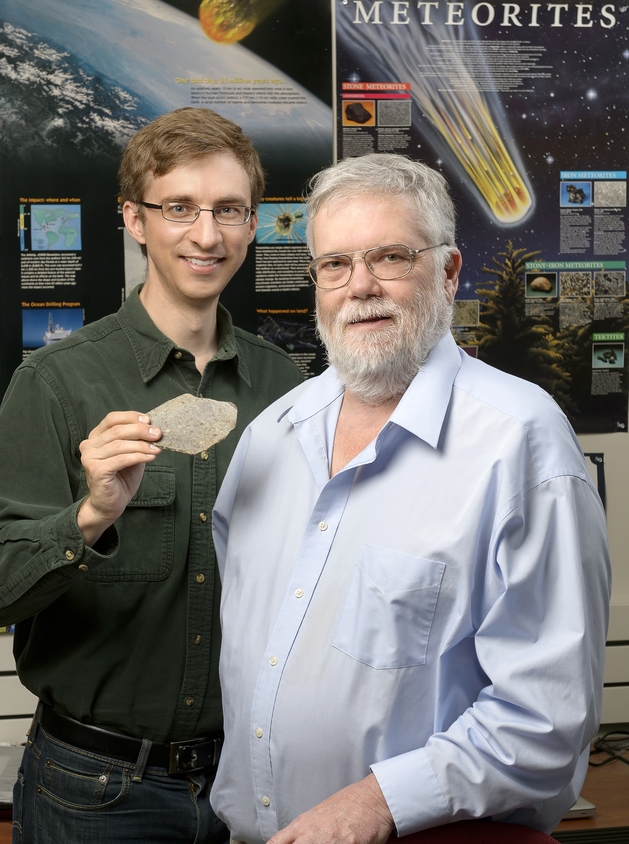 David Minton (sx) e Jay Melosh (dx) con un frammento di meteorite contenente condrule. Crediti: Purdue University/John Underwood