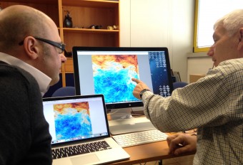 Due degli scienziati di Planck (Paolo Natoli, a sx, dell’Università di Ferrara e Reno Mandolesi, a dx, associato INAF nonché responsabile dello strumento LFI) osservano la nuova mappa in polarizzazione
