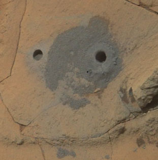 Una polverina grigia circonda i fori di campionamento che il rover Curiosity ha praticato sulla superficie di Marte il 29 gennaio 2015 nel sito denominato “Mohave 2”. Crediti: NASA/JPL-Caltech/MSSS