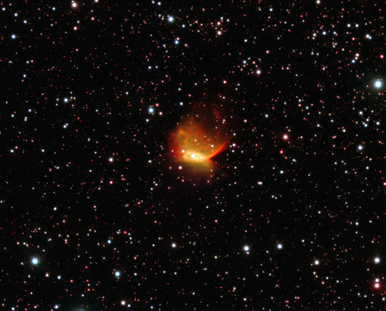 L’immagine della singolare nebulosa planetaria Henize 2-428 è stata ottenuta con il VLT (Very Large Telescope) dell’ESO all’Osservatorio del Paranal in Cile. Crediti: ESO