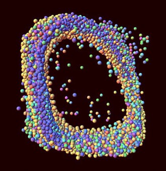 L’immagine, raffigurante la variazione di luminosità di KIC 5520878 in funzione di versioni successive precedenti, rappresenta un attrattore non-caotico che guida le pulsazioni in cui si notano minuscole strutture frattali. Le sfere di egual dimensione sono i dati; i colori (dal rosso al violetto) codificano il tempo. Credit: John F. Lindner et al. 2015