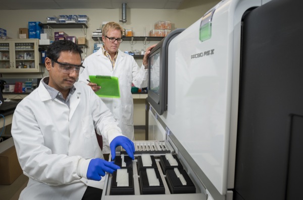 Chandran Sabanayagam and Bruce Kingham work together in the sequencing facility in DBI.