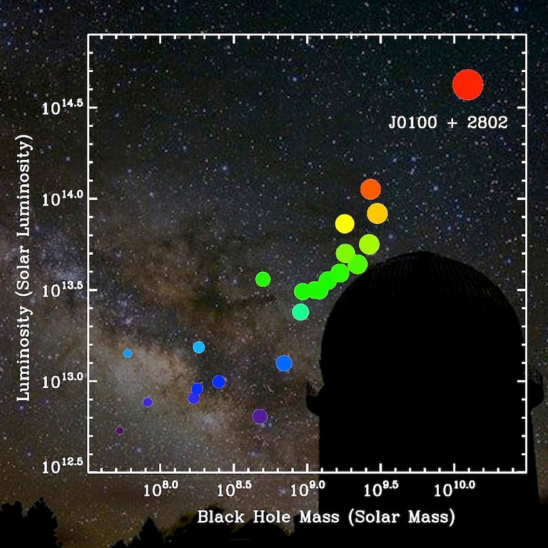 Dopo la selezione, gli astronomi hanno approfondito le loro indagini: il primo spettro ottico ottenuto il 29 dicembre 2013 dal telescopio LJT, aveva fatto subito sospettare che SDSS J0100 + 2802 fosse un quasar tra i più distanti mai osservati. Ulteriori osservazioni condotte con il MMT, LBT, il Magellan Telescope e il Gemini Telescope hanno infine confermato le caratteristiche estreme di questa sorgente: con una luminosità pari a 420.000 miliardi di volte quella del nostro Sole, questo nuovo quasar è 7 volte più luminoso di quello ad oggi più distante, la cui luce ha viaggiato per ben 13 miliardi di anni. Aggiungendo anche un’altra eccezionale proprietà, ovvero ospitare un buco nero con una massa di 12 miliardi di masse solari, SDSS J0100 + 2802 diventa il quasar più luminoso con il più massiccio buco nero tra quelli all’alba dell’universo.