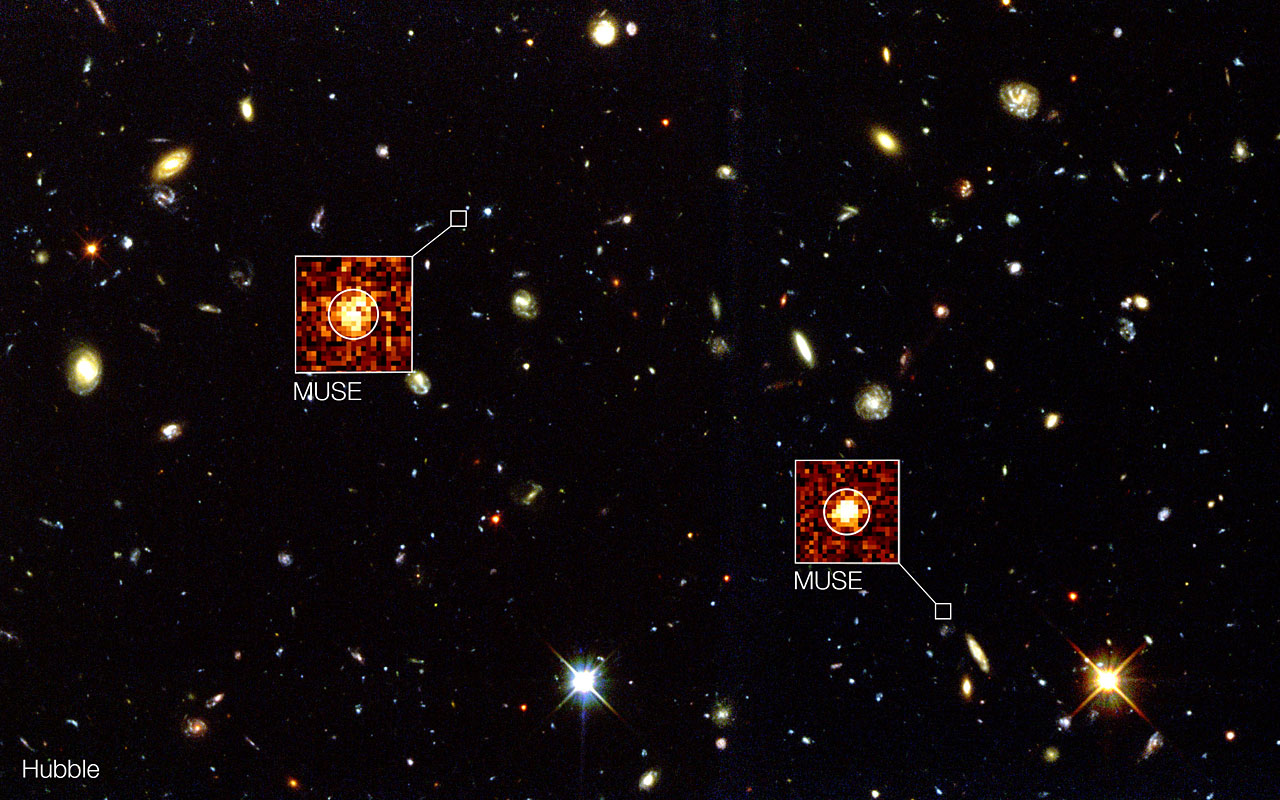 Anche se il tempo totale di esposizione è stato molto inferiore di quello delle immagini di Hubble, i dati MUSE del HDF-S hanno rivelato in questo piccolo lembo di cielo più di venti oggetti molto deboli che Hubble non aveva visto per nulla. MUSE è particolarmente sensibile a oggetti che emettono la maggior parte dell’energia ad alcune lunghezze d’onda particolari, che appaiono come punti brillanti nei dati. Le galassie dell’Universo primordiale hanno di solito spettri di questo tipo poiché contengono idrogeno gassoso che risplende a causa della radiazione ultravioletta delle giovani stelle calde.