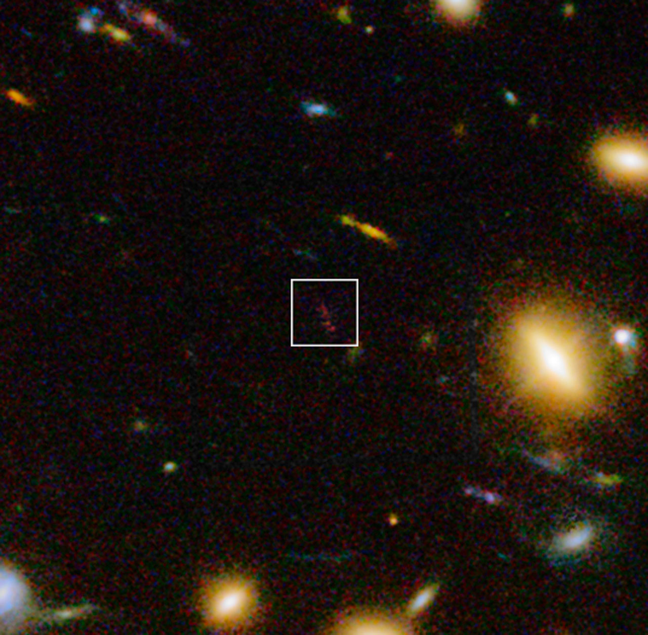 Veduta composita ottenuta con riprese in luce infrarossa dello strumento WFC3 montato sul telescopio spaziale Hubble della NASA/ESA e immagini in luce visibile. In primo piano è visibile l’ammasso di galassie Abell 1689. La remota galassia A1689-zD1, dietro di esso, è indicato nel riquadro.
