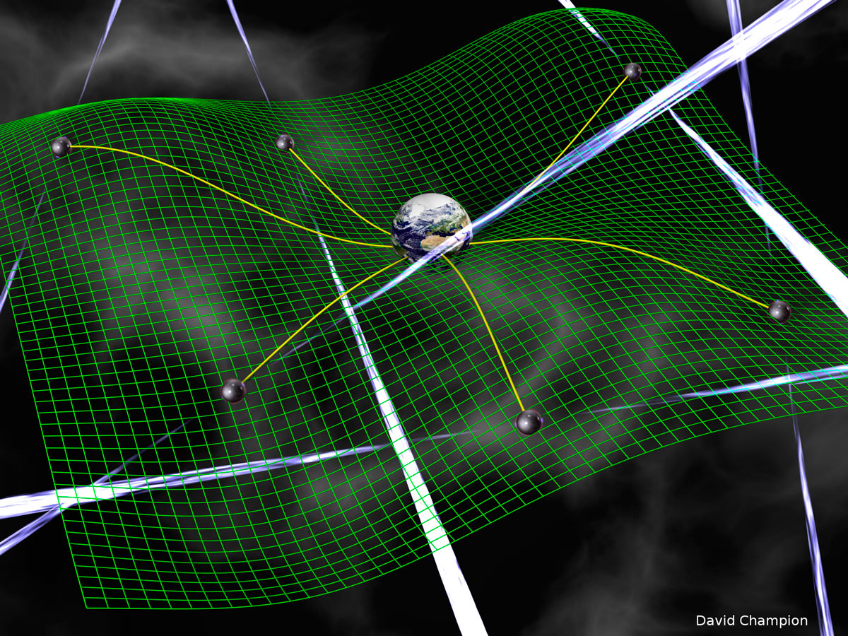 Una rete di pulsar utilizzate per la ricerca di onde gravitazionali, le increspature dello spazio-tempo previste dalla Relatività Generale. Queste onde provocano ritardi nei tempi di arrivo dei segnali radio che provengono dalle pulsar. Questi ritardi sono misurabili da Terra con osservazioni di timing radio estremamente sensibili. Crediti: David Champion