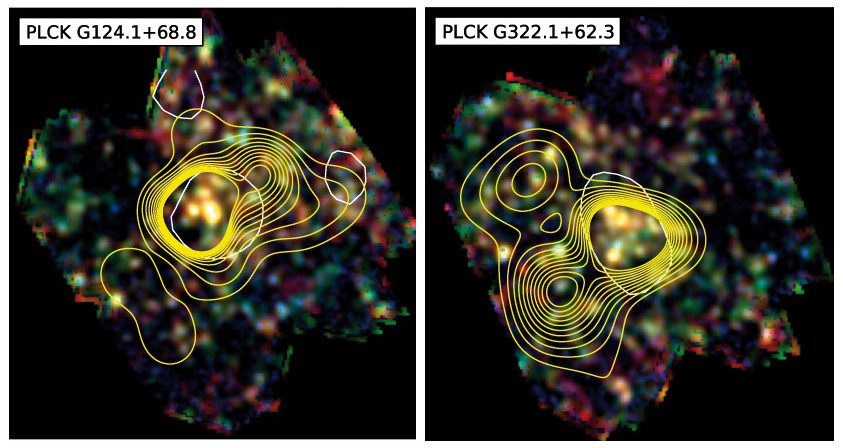 In basso al centro, la mappa a tutto cielo di Planck a 545 GHz. La fascia grigia orizzontale corrisponde all’emissione della polvere della nostra Via Lattea. I puntini neri indicano invece la posizione dei candidati protoammassi. Nei riquadri tutt’attorno, alcune delle osservazioni compiute successivamente con lo strumento SPIRE di Herschel. Le curve di livello si riferiscono alla densità di galassie presenti nell’ammasso. Crediti: ESA and the Planck Collaboration/ H. Dole, D. Guéry & G. Hurier, IAS/University Paris-Sud/CNRS/CNES