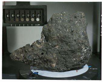 I ricercatori della UMD hanno esaminato la composizione isotopica del tungsteno di due rocce lunari che sono state raccolte dalla missione Apollo 16, tra cui il campione di roccia che ha la sigla 68815 mostrato nell’immagine. L’analisi comparativa indica che le composizioni isotopiche del tungsteno presenti nella Terra e nella Luna sono simili. Credit: NASA/JSC