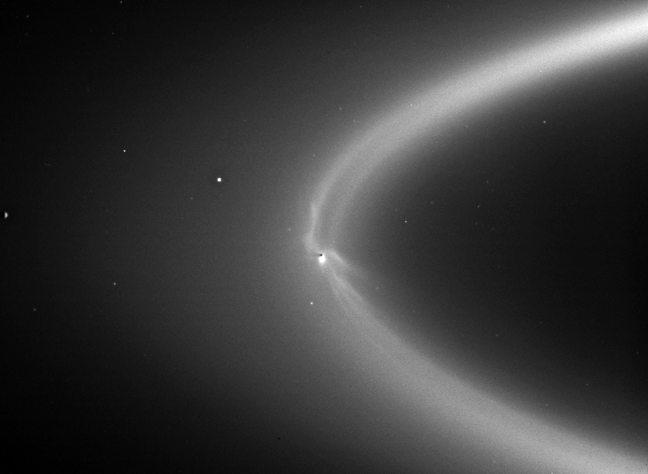 In particolari condizioni di luce il ghiaccio estruso dalla luna ghiacciata viene illuminato e si mostra in tutta la sua maestosità nelle immagini raccolte da Cassini. Un riccio di polvere e ghiaccio che si estende nello spazio per decine di migliaia di chilometri. Tanto da spingere gli scienziati a immaginare che sia Encelado stessa, con i suoi geyser ad alimentare la porzione di anello che la lambisce. Ipotesi che verrebbe confermata dalla dimensione dei frammenti che compongono l’anello E di Saturno, congruenti ai granuli di ghiaccio che compongono i geyser.