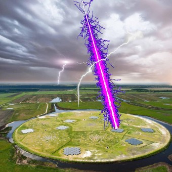 Una doccia di particelle prodotta da un raggio cosmico raggiunge LOFAR attraversando una nube temporalesca. Crediti: Radboud University