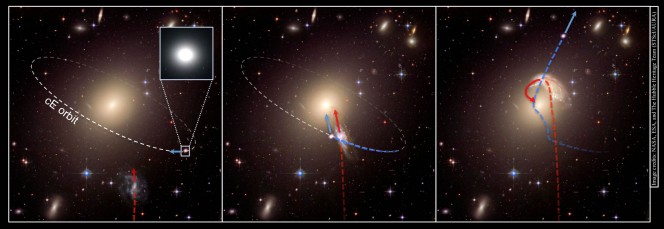 In questi tre esempi di interazione gravitazionale a tre corpi viene mostrata la formazione di una galassia ellittica compatta (linea blu) mentre viene ‘scalciata’ via dal proprio ammasso di galassie. Credit: ESA/Hubble. Illustrazione di Andrey Zolotov