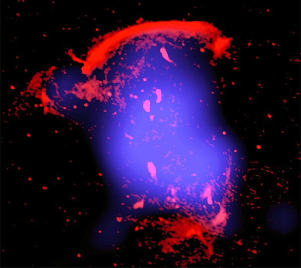 Gli ammassi di galassie sono come delle città, dove migliaia di galassie possono trovarsi accalcate, almeno se paragoniamo gli ammassi allo spazio intorno a loro, scarsamente popolato. Nel corso di miliardi di anni hanno costruito la struttura dell’universo fondendosi con ammassi adiacenti, proprio come le città in crescita assorbono le città vicine. Quando questo accade, vi è uno scontro tra ammassi e un enorme rilascio di energia. L’onda d’urto viaggia attraverso l’ammasso come un vero e proprio tsunami, ma fino ad ora non vi era alcuna prova che le galassie ne venissero direttamente colpite.