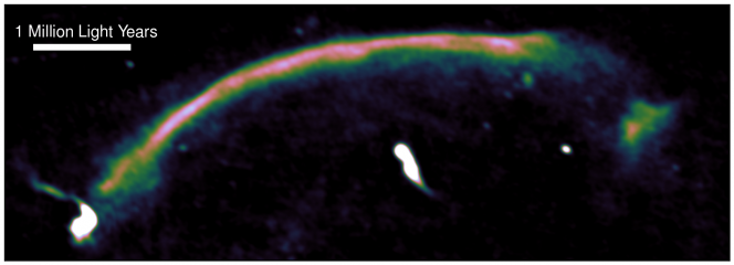 Un’immagine radio mette in evidenza l’onda d’urto all’interno dell’ammasso “salsiccia”, che appare come un arco luminoso che va da in basso a sinistra in alto a destra. L’immagine è stata realizzata utilizzando il Giant Metrewave Radio Telescope. L’onda d’urto è stata generata un miliardo anni fa, quando i due ammassi originali si sono fusi, e si muove alla velocità molto elevata di 9 milioni di km/h. Crediti: Andra Stroe