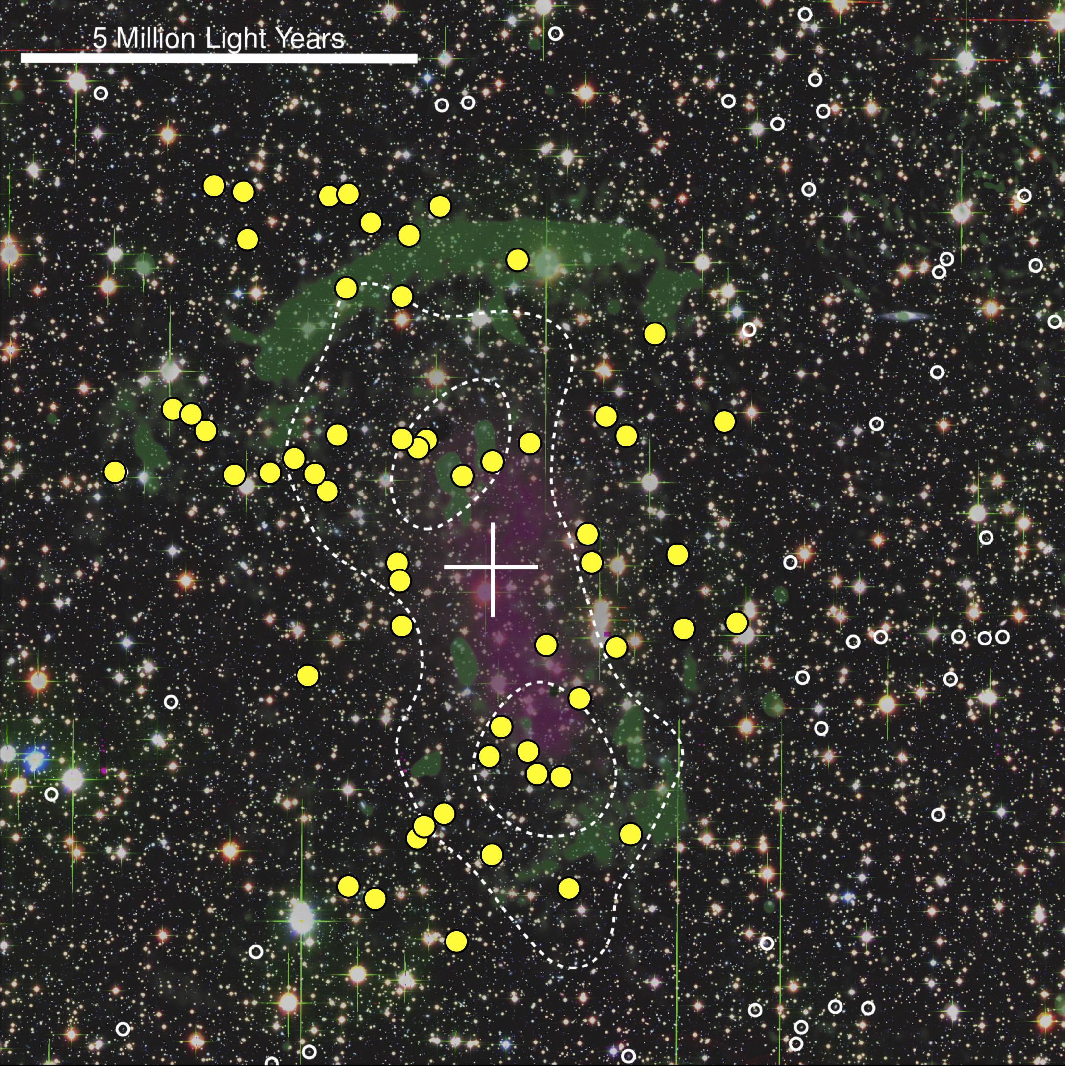 Un’immagine composita dell’ammasso “salsiccia” CIZA J2242.8 + 5310 realizzata con i dati del Subaru e Canada France Hawaii Telescope. I cerchi bianchi indicano galassie al di fuori dell’ammasso, mentre cerchi gialli sono galassie in cui sta avvenendo formazione stellare accelerata. In verde sono evidenziate le regioni che emettono nel radio e che tracciano le onde d’urto, in viola il gas caldo presente tra le galassie, che emette nei raggi X. Gli altri punti di luce sono stelle in primo piano lungo la linea di vista. L’ammasso è uno dei più massicci che si conoscano nell’universo. Crediti: Andra Stroe