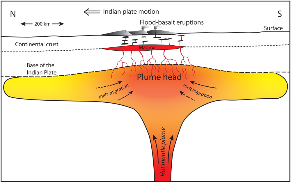 Illustrazione di un pennacchio di manto caldo al di sotto della Placca indiana. La teoria di Richards e dei suoi collaboratori suggerisce che il magma presente all’interno di questo pennacchio potrebbe essere stato messo in moto da una forte scossa sismica dovuta all’impatto dell’asteroide Chicxulub, causando così la più grande delle eruzioni di basalto dei Trappi del Deccan.