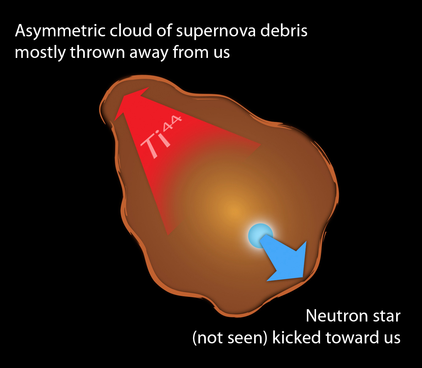 Questo per quanto riguarda le simulazioni, d’accordo. Ma come cercarle, queste asimmetrie, su esplosioni avvenute a centinaia di migliaia di anni luce da noi? Il team di NuSTAR c’è riuscito osservando il redshift delle due righe d’emissione – quella a 67.87 keV e quella a 78.32 keV – del titanio-44. Isotopo radioattivo sintetizzato dalla stessa supernova, il titanio-44 è in grado di funzionare da “tracciante” ideale, visto che le sue due righe cadono entrambe (seppure di poco) all’interno dell’intervallo d’energie alle quali lo spettroscopio di NuSTAR è sensibile. Il risultato non ha lasciato dubbi: lassù la materia s’è mossa – a velocità elevatissime, migliaia di km al secondo – in modo non uniforme. Per la precisione, quella che è stata sparata in direzione opposta rispetto a noi osservatori (dunque s’è allontanata, spostando le righe verso il rosso) è in quantità significativamente superiore a quella che s’è avvicinata (spostando le righe verso il blu). Innescando così, ipotizzano gli scienziati del team, una sorta di rinculo: l’esplosione da una parte, il collasso in un invisibile oggetto compatto dall’altra.