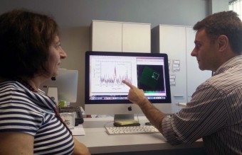 Simonetta Puccetti e Matteo Perri, ricercatori dell’INAF di Roma, indicano sullo schermo il grafico con le due righe d’emissione del titanio-44 il cui redshift è stato misurato da NuSTAR