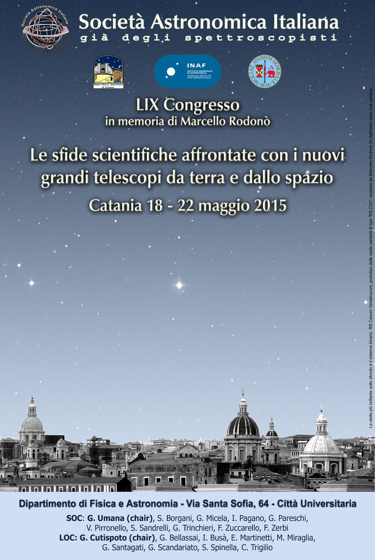 Al via con la cerimonia di apertura, la 59° edizione del congresso nazionale della Società Astronomica Italiana (SAIt). Il tema di quest’anno è “Le sfide scientifiche affrontate con i nuovi grandi telescopi da terra e dallo spazio”. Il meeting si svolgerà a Catania, presso il Dipartimento di Fisica e Astronomia dell’Università, dal primo pomeriggio di oggi fino a venerdì 22 maggio. Il congresso sarà dedicato alla memoria del Prof. Marcello Rodonò, nel decimo anniversario della sua scomparsa.