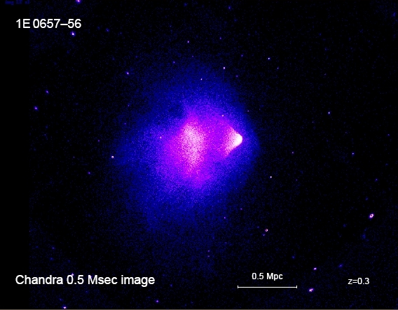 L’immagine del Bullet Cluster ripresa da Chandra con un tempo di esposizione di 140 ore. Si nota la forma a ‘proiettile’ del gas a seguito dell’interazione dei due ammassi. Credit: NASA/Chandra X-ray Observatory