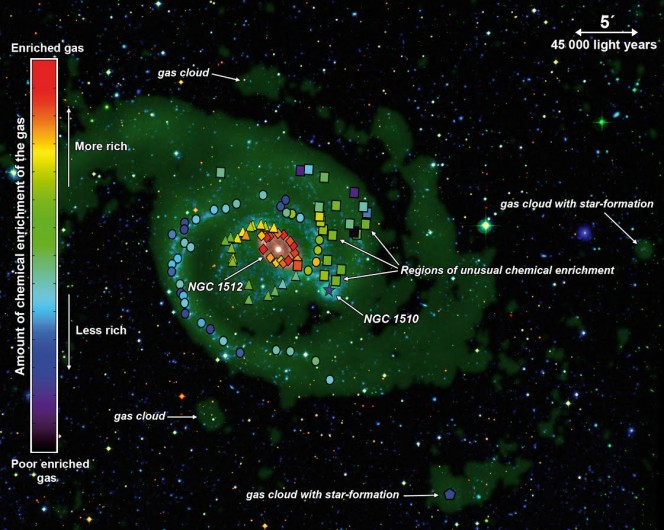 «Ci aspettavamo di trovare gas arricchito tanto quanto quello presente nella galassia che sta inghiottendo, ma ci siamo resi conto con stupore che stavamo osservando gas prodotto da resti di galassie ingerite in precedenza», ha detto López-Sánchez. «Il gas diffuso nelle regioni esterne di NGC 1512, non è il gas incontaminato creato durante il Big Bang, ma gas che è già stato elaborato da precedenti generazioni di stelle».