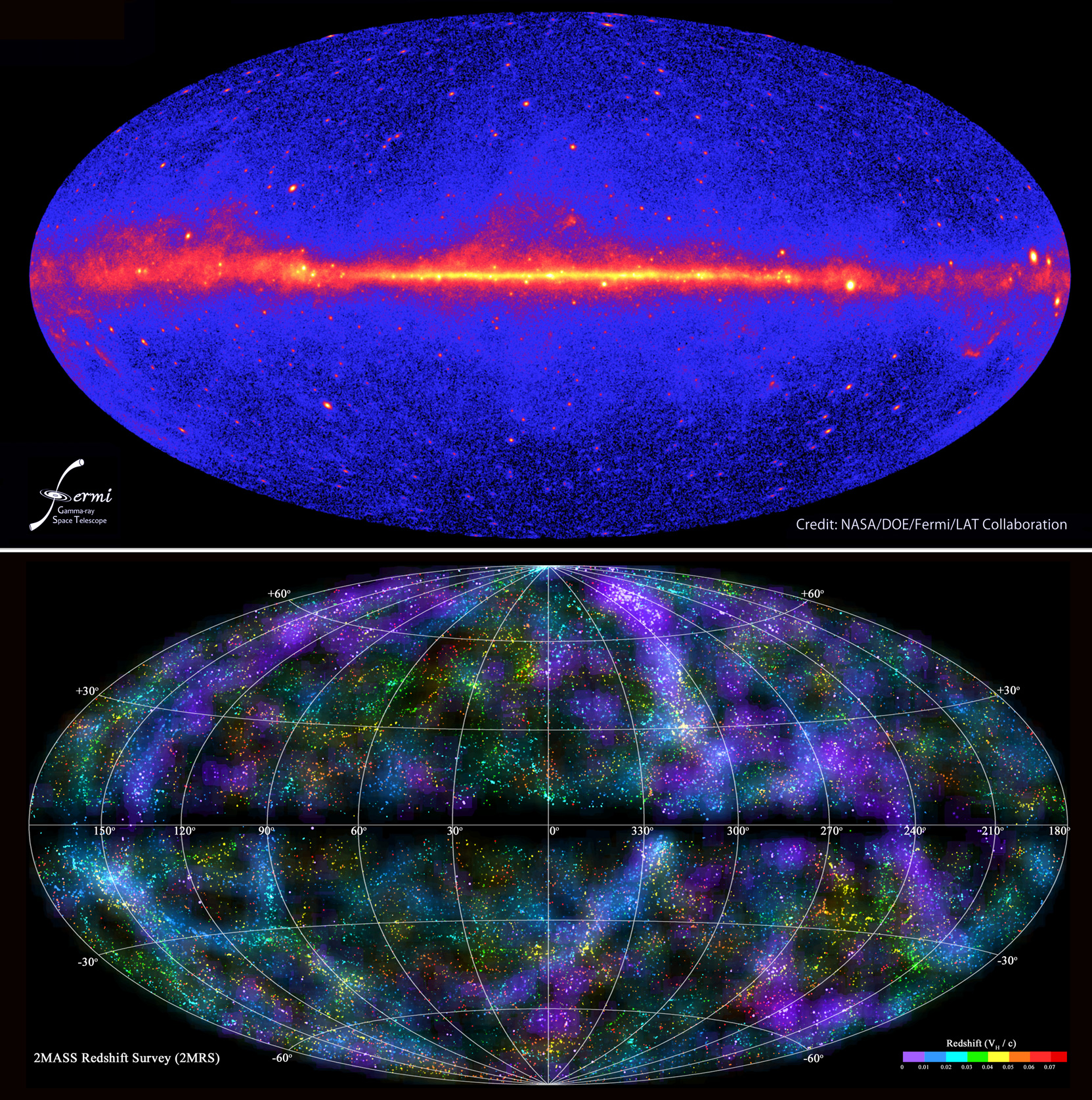 In alto, il cielo gamma osservato da Fermi della NASA. In basso, una delle mappe a tutto cielo della survey 2MASS