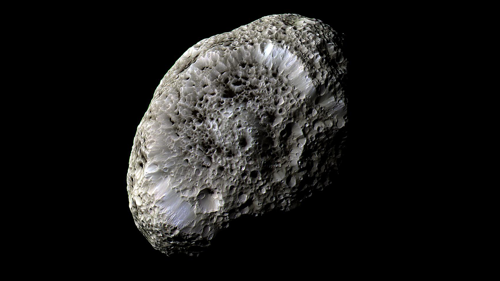 Una luna, almeno dall’aspetto, “spugnosa” a causa della sua densità insolitamente bassa, soprattutto se si pensa a un oggetto così grande (è il corpo irregolare più grande del sistema solare dopo Proteo – una luna di Nettuno). Questa densità (circa metà di quella dell’acqua) rende Iperione abbastanza poroso, con una debole gravità superficiale. Cosa vuol dire? Ogni oggetto che impatta con la superficie crea un profondo cratere e parte del materiale (non trovando resistenza gravitazionale) viene espulso dalla luna. Iperione presenta, inotre, un’albedo bassa (0,3), essendo ricoperto da uno strato di materiale piuttosto scuro.