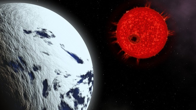 Rappresentazione artistica del sistema della stella GJ1214. In primo piano il suo pianeta, GJ1214b, avvolto da un fitto strato di nubi. Sullo sfondo, la stella nana rossa con una prominente macchia stellare, la cui occultazione da parte di GJ1214b è stata registrata grazie alle osservazioni del Large Binocular Telescope, di cui l’INAF è uno dei partner. Crediti: Marco Galliani – Media INAF